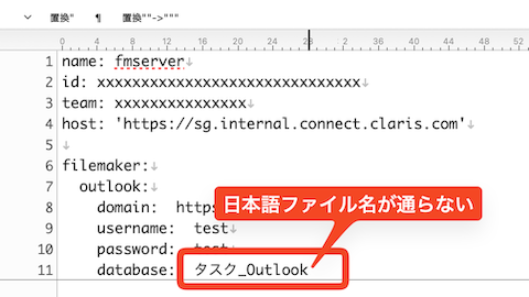 configuration.ymlの指定がすべて正しいはずなのに通らないFileMakerファイルが日本語になっているのが原因 →英語ファイル名にすることで解決 接続の問題は、agent.logを参照して掘り下げるClaris Connect側...