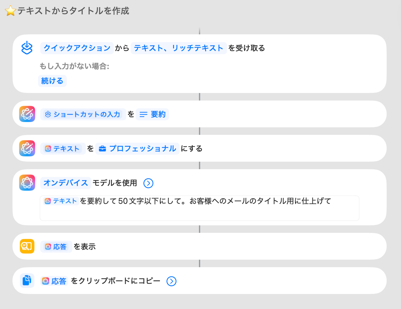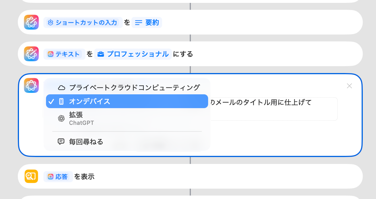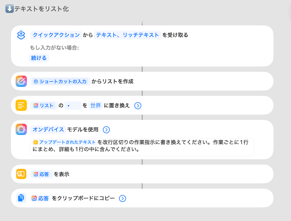 内部的には、Apple Intelligenceの「テキストからリスト作成」機能を使いながら「改行区切りの作業指示に変換してください」といったプロンプトを加えて、実務で扱いやすい形式に整えています。