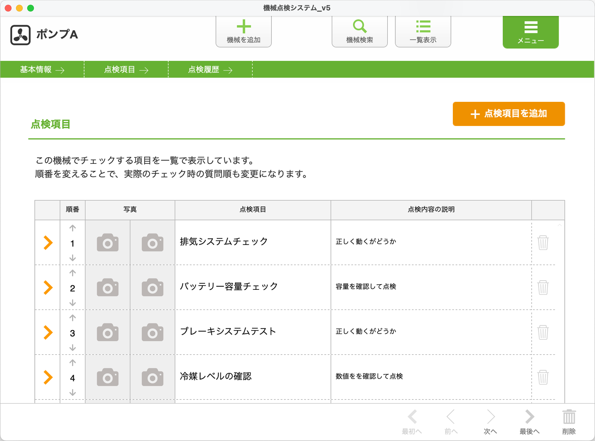 機械の登録から点検箇所の設定、実施まで一元管理できる点検管理システムです。