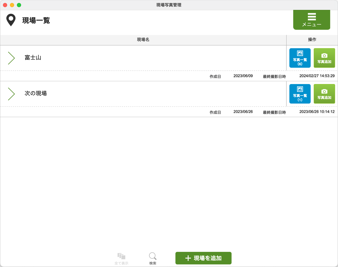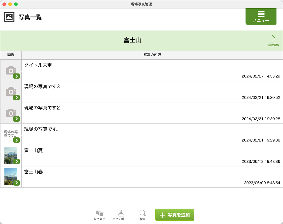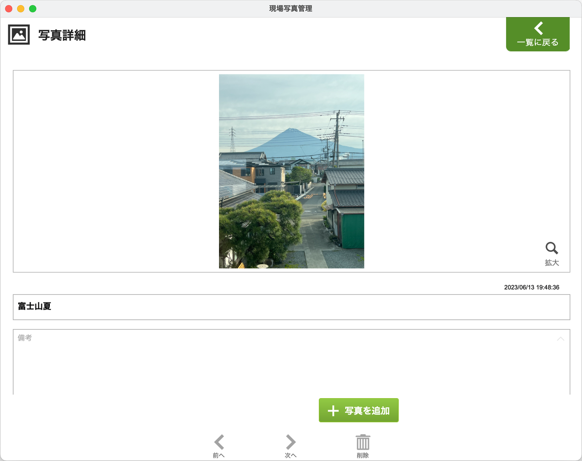 現場ごとに写真を効率的に管理、撮影できるツールで、現場の情報を追加、保存することが可能です。